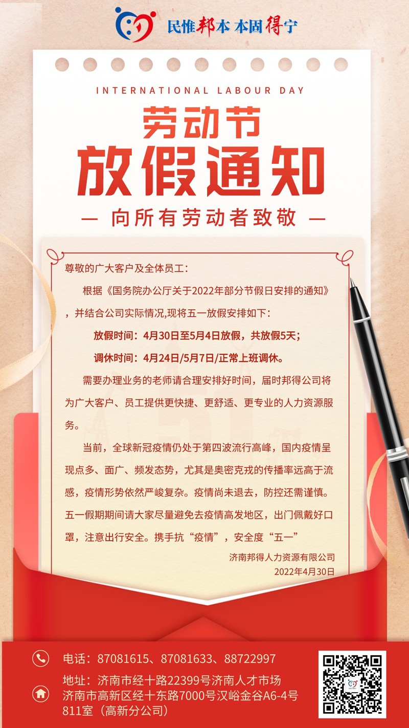 • 2024年5月濟南邦得人力資源有限公司高新分公司關于開展...